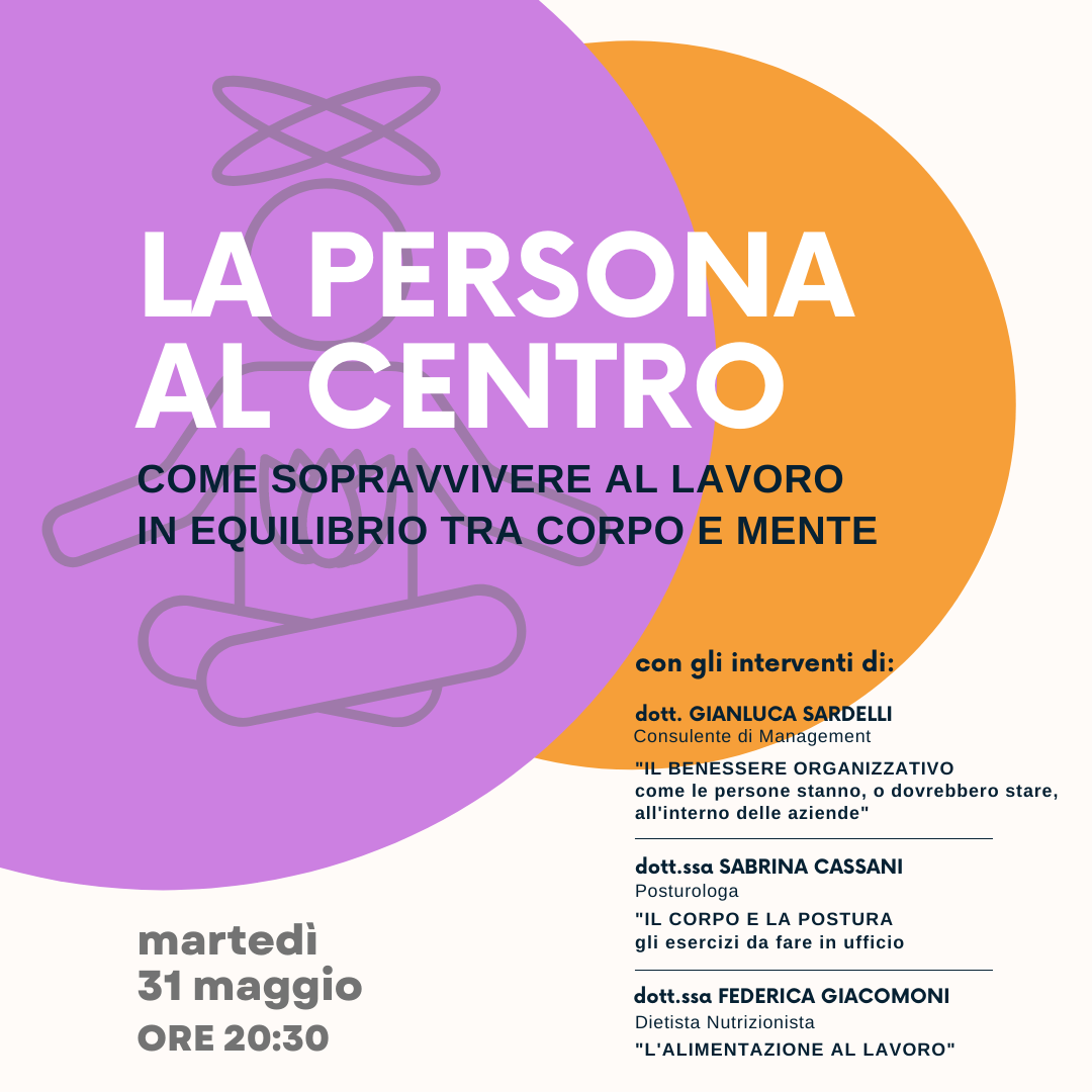Martedì 31 maggio, con due amiche, Sabrina Cassani – Posturologa e Federica Giacomoni Dietista Nutrizionista, faremo una chiacchierata/incontro sul tema del lavoro e del benessere legato al lavoro.Lo analizzeremo da tre punti di vista: il Benessere Organizzativoil Corpo e la Postura che noi assumiamo mentre lavoriamol’Alimentazione al lavoro Tutti e tre questi temi saranno presi…